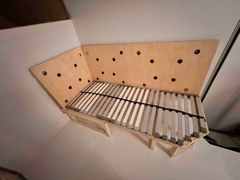 Nachdem die Küche nun einen gewissen Bauzustand erreicht hat, wurde mit der Konstruktion der Sitzecke begonnen. Um ein wenig Gewicht zu sparen und eine gute Belüftung der Polster sicherzustellen, haben wir uns für eine Nutzung von Lattenrosten (70x200 cm) als Sitzflächen-Unterkonstruktion entschieden. Bei Ebay Kleinanzeigen wurden wir schnell für wirklich wenig Geld fündig.