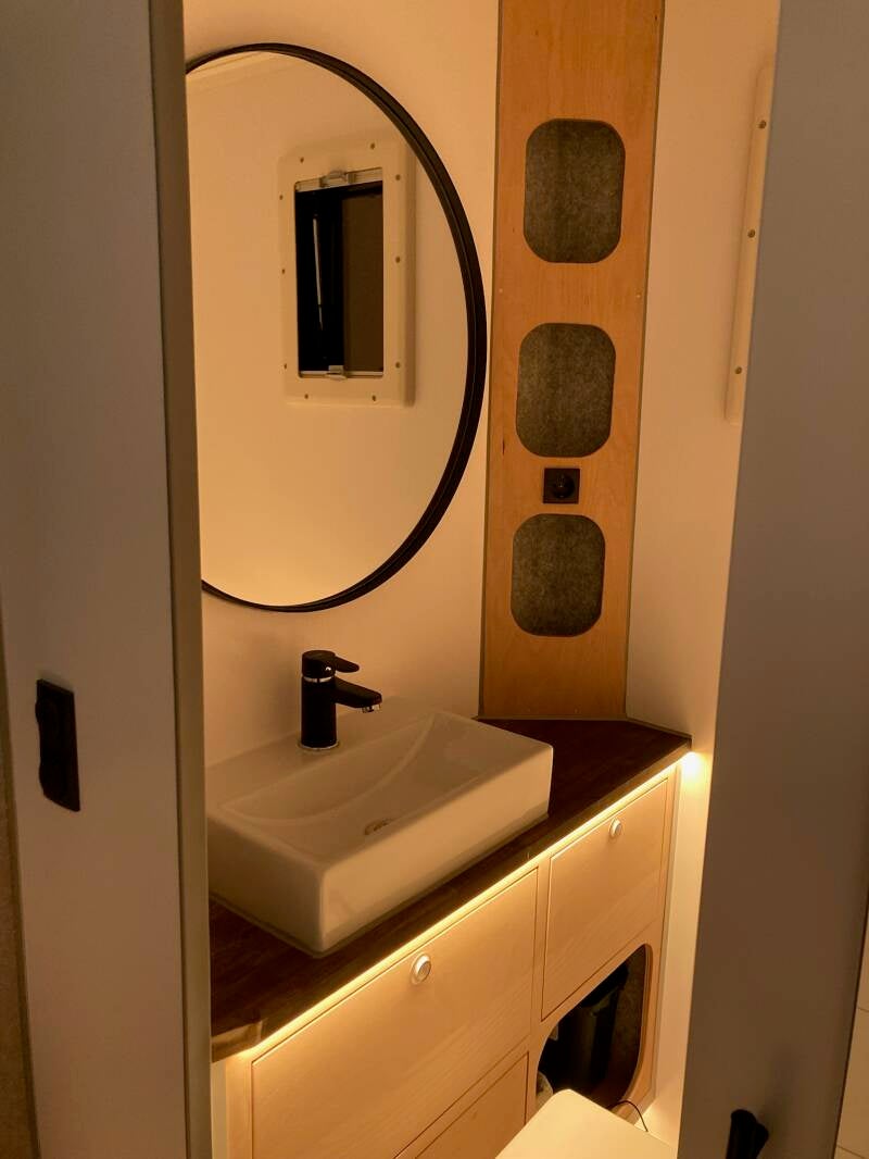 Beim Waschbecken haben wir auch nach langen Überlegungen ein Porzellan-Waschbecken verbaut. Eine kleine schmale Version - zum Zähneputzen und Waschen vollkommen ausreichend. Auch der Spiegel (von Jysk) durfte neben ein wenig Licht nicht fehlen. Dieser wurde fest verklebt, damit er natürlich auch während der Fahrt oder bei Bremsmanövern an Ort und Stelle bleibt.