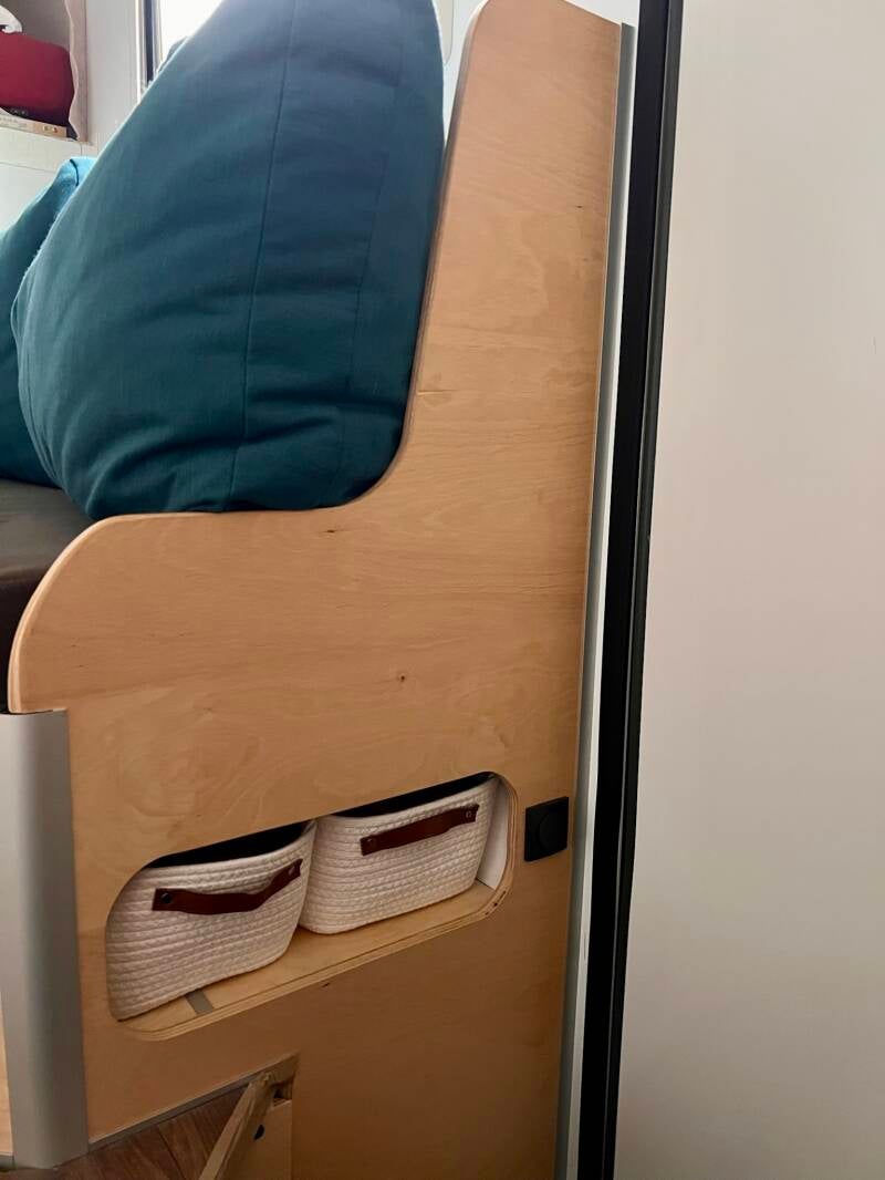 Sobald man den Einstieg passiert hat, befindet sich bei uns auf der rechten Seite in der Sitzbank integriert ein Einschubfach mit Körben: für Mützen, Handschuhe, Sonnenhüte, Einkaufstaschen und so allerlei. Auf der linken Einstiegsseite entsprechend die Garderobe mit zahlreichen Jackenhaken und integrierter Heizung, um auch nasse Kleidung trocknen zu können.