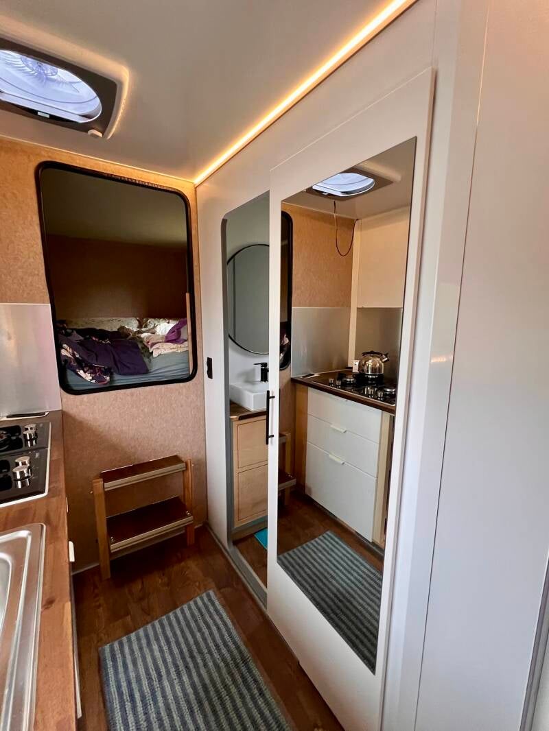 Dann kam die Herausforderung der Badtüre: wir wollten gerne eine Schiebetüre. Die meisten Schiebetürbeschläge sind jedoch weniger für den Einbau in Fahrzeugen geeignet, wen wundert es. Zudem sollte der Beschlag natürlich am besten eine gewisse "Einrastfuktion" haben, damit die Türe während der Fahrt nicht auf- und zu geht. Nach längeren Überlegungen haben wir uns für normale Schubladenscharniere mit integriertem Softclose entschieden, auf die wir eine Ikea Schrank Front aufgeschraubt haben. Mit einem Türgriff und einem schönen Türspiegel, einer Laufschiene am Boden und Borstendichtungen erscheint es vorerst als gute Lösung. Wir werden diese Konstruktion in der Praxis ausgiebig testen. Nach den ersten Fahrten ist alles super. Die Tür bleibt an Ort und Stelle und bewegt sich auch während der Fahrt nicht. Sie erfüllt vollkommen ihren Zweck.