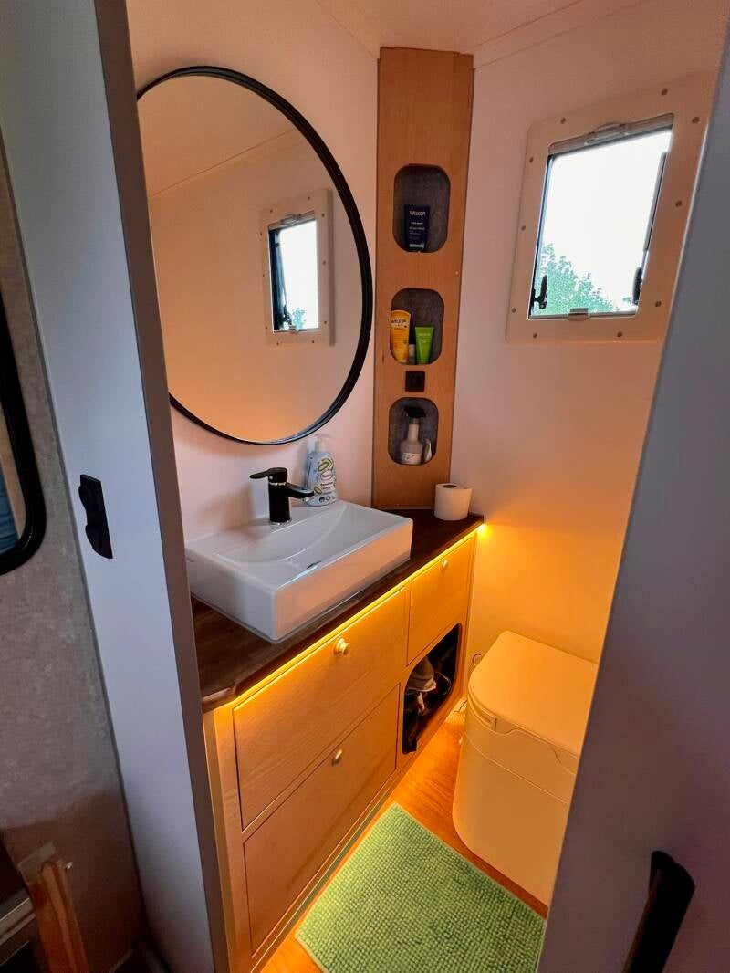 Auch ein kleiner Badschrank mit Schubladen, einem Mülleimerfach und einem offenen Fach für Handtücher wurde gebaut. Auch hier Fußboden verlegt und die OGO-Trockentrenntoilette fest verschraubt, Abluftschlauch verlegt und 12 Volt Anschluss angeschlossen. Die Toilette wurde so befestigt, dass man sie ab und an auch nochmal herausnehmen kann, z.B. zur jährlichen Grundreinigung :)