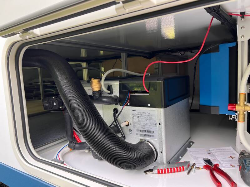 Dann haben wir ein Schnäppchen bei einem Händler erstanden: eine Vorführ-Alde-Heizung 3030 Plus. Diese wurde natürlich direkt verbaut und die Verrohrung vorgenommen. Dafür wurden paketweise Gummiverbinder sowie Schellen bestellt. Bei dem Heizungsrohr haben wir auf übliches 22x1mm Alurohr zurückgegriffen. Anschließend wurde das System mit Gas- und Wasseranschluss versehen, mit ca 20l Glykol - destilliertes Wasser - Gemisch gefüllt und getestet. Der Ausgleichsbehälter wurde bei uns hinter dem Kühlschrank nach Anleitung verbaut.