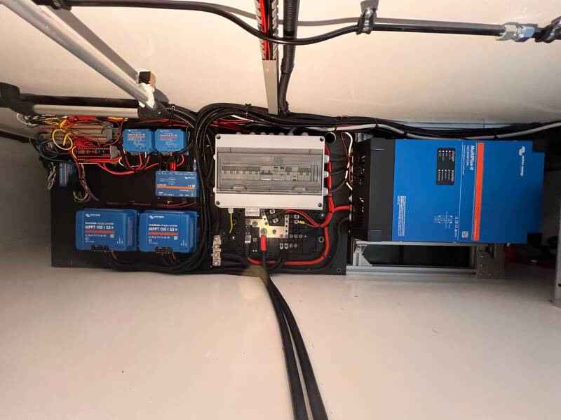Nachdem immer wieder vereinzelnd Steckdosen, Lichtschalter und sonstige Elektronikteile eingebaut wurden, begann auch die Verkabelung sowie der Einbau der ersten Elektronikkomponenten. Die 8 KW Batterie wurde bereits zusammengebaut und wartet auf ihren ersten Einsatz. Nun ist der Wechselrichter eingetroffen und schon eingebaut. Zusammen mit dem familieneigenen Elektroingenieur lassen sich hier natürlich die verschiedensten Konzeptmöglichkeiten durchspielen.