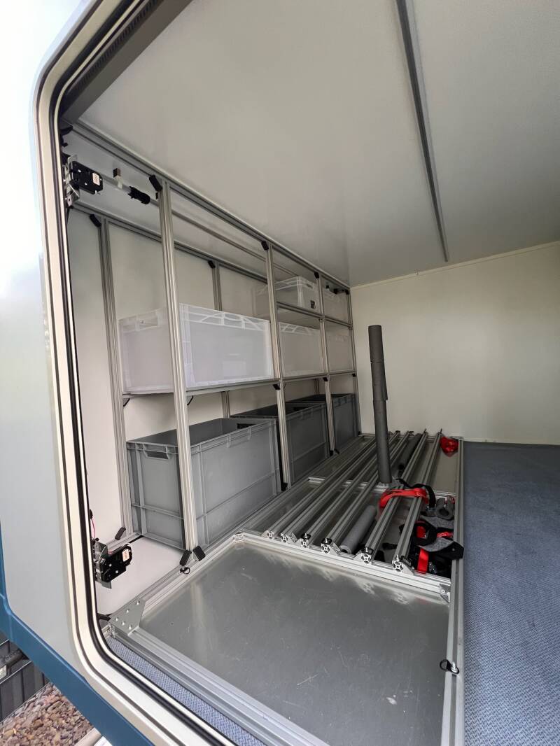 Für die erste Tour ist er erstmal am Heckregal befestigt und alles eher "provisorisch" und zum testen. Nach den ersten Touren haben wir festgestellt, dass diese Bauweise schon sehr praktikabel ist, man jedoch mehr Platz zum Heckregal hin benötigt. Somit wurde dieser Abstand vergrößert und aktuell verzichten wir erstmal auf den Vollauszug, da auch so die Be- und Entladung der Räder gut funktioniert.